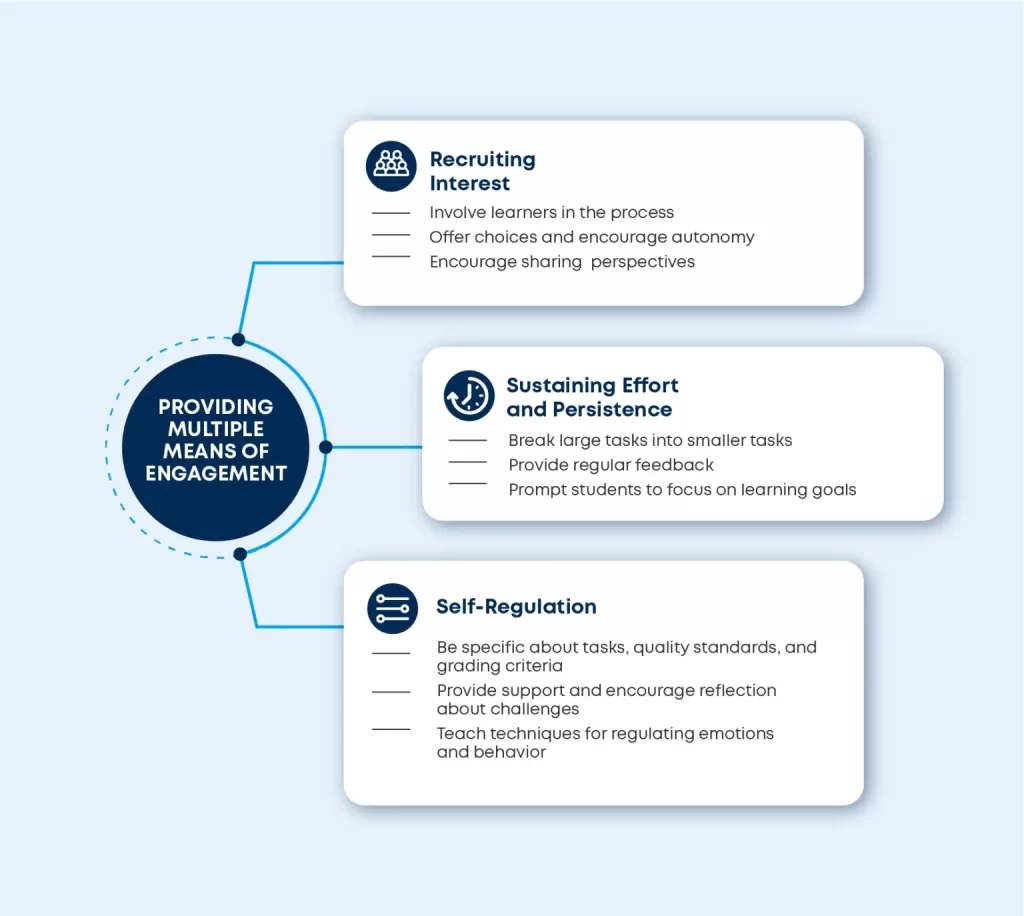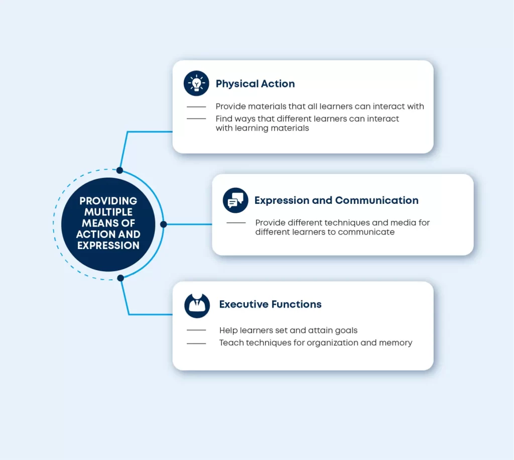 This principle helps educators provide students with a variety of ways to demonstrate what theyโve learned. Learners differ in how they navigate through learning environments and demonstrate what they know.