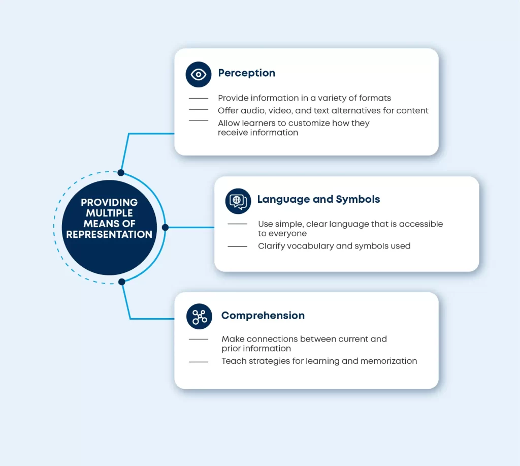 This principle encourages educators to present information in a variety of formats. The same concept could be presented in text, through images, through a video, via audio, or through hands-on activities. Learners may require assistive technologies and devices that aid learningโsuch as screen readers, automatic page turners, voice recognition programs, or closed captioning devicesโto access this content.